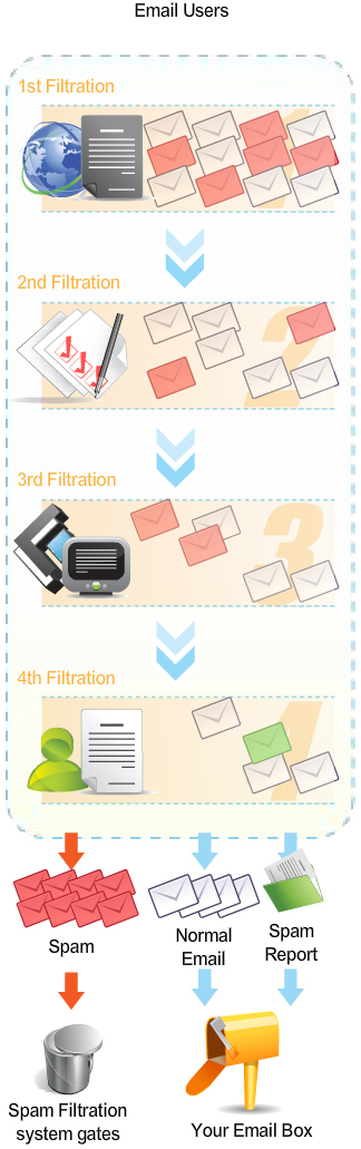We collect the international black lists of spam from several organizations. In first level filtration, we are following the latest rules and conditions to filter the spam which possesses the computer virus. In this filtration, it can separate 40%-50% of spam of incoming email.